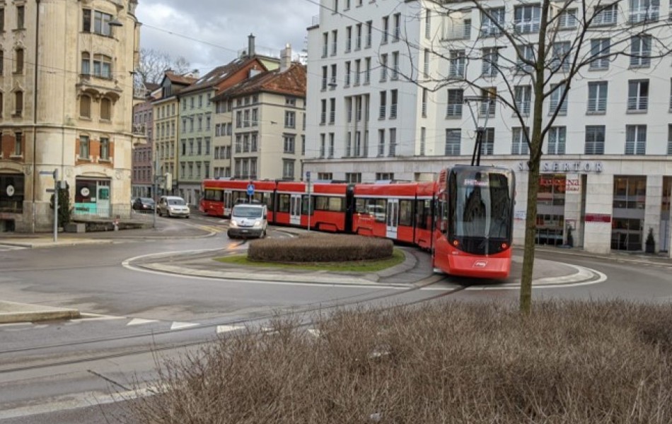 Doppelspuren, die quer durch einen Kreisel verlaufen, existieren in der Schweiz bereits an verschiedenen Orten, wie hier beim Spisertor in St.Gallen.
