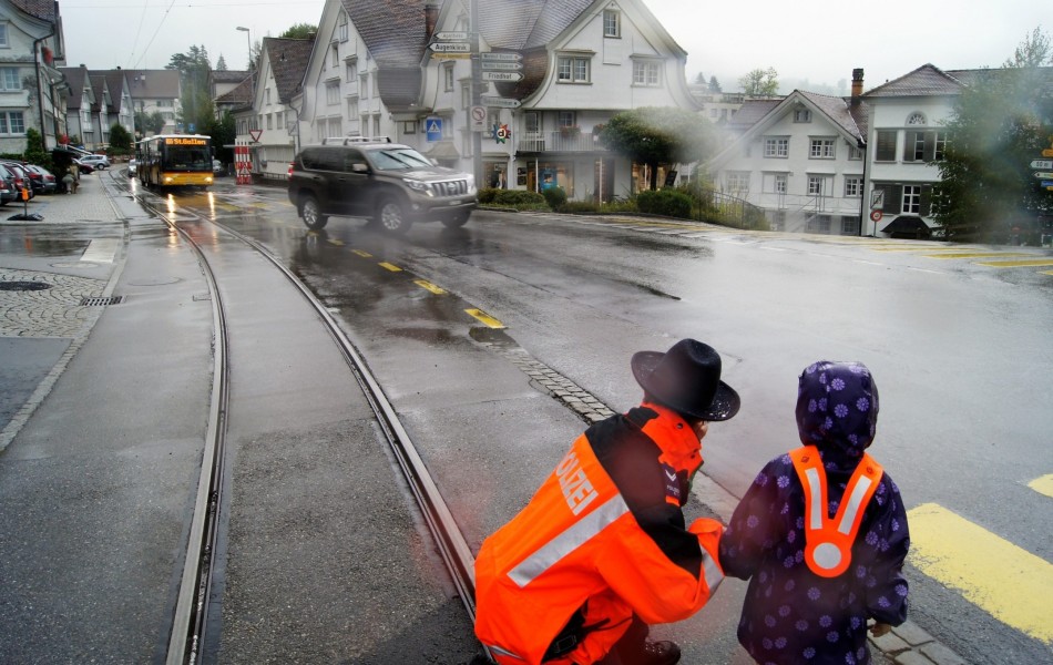 Bevor es ans Überqueren der Hauptstrasse geht, gibt der Polizist Instruktionen.