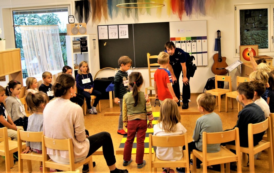 Mit dem Polizisten an der Hand üben die Kindergärtler das korrekte Verhalten auf der Strasse.