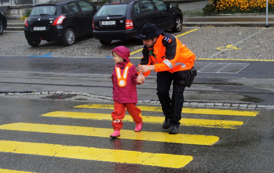 2. Keine Zeichen, weder Hand- noch Lichtzeichen, verwenden, da diese das Kind dazu verleiten können, die Fahrbahn zu betreten, ohne auf den restlichen Verkehr zu achten. Es ist wichtig, dass das Kind selber entscheidet, wann es den ersten Schritt tut.