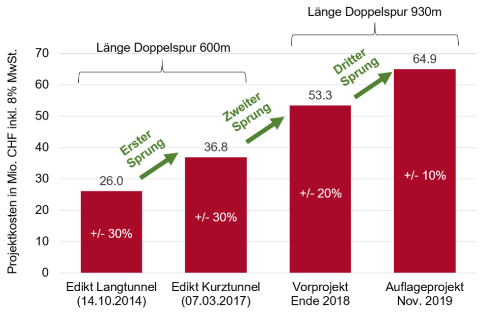 Drei grosse Sprünge mit jeweils verschiedenen Kostentreibern sind bei der Verifizierung der Doppelspur-Kosten auszumachen: